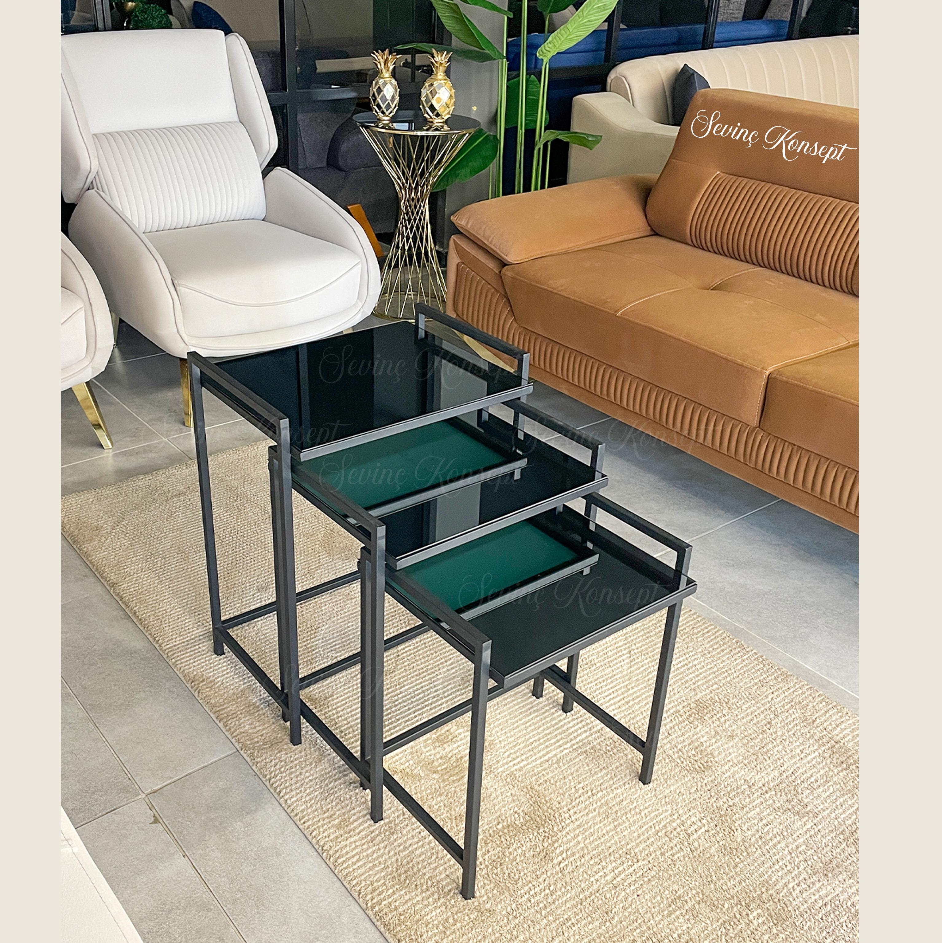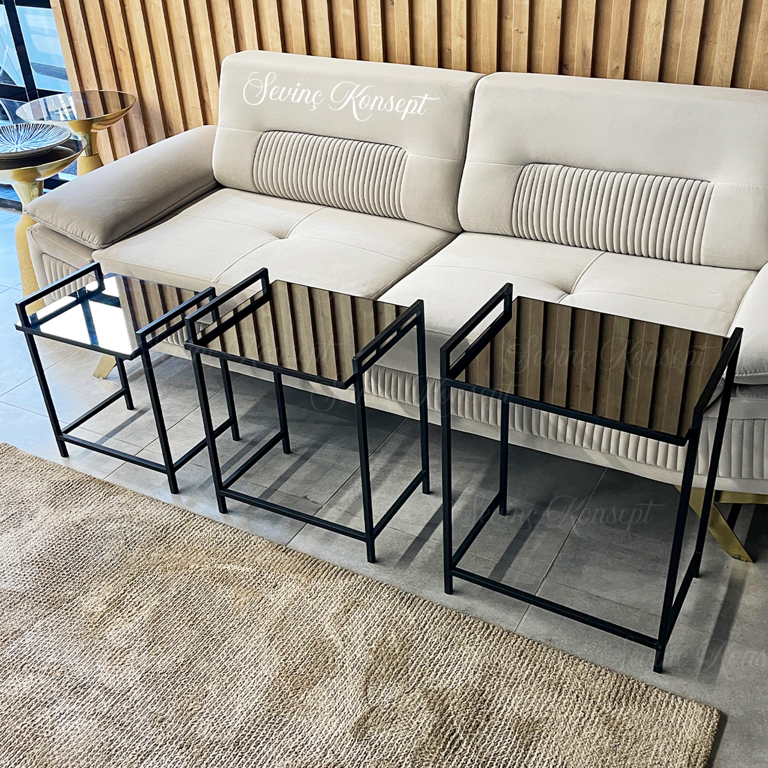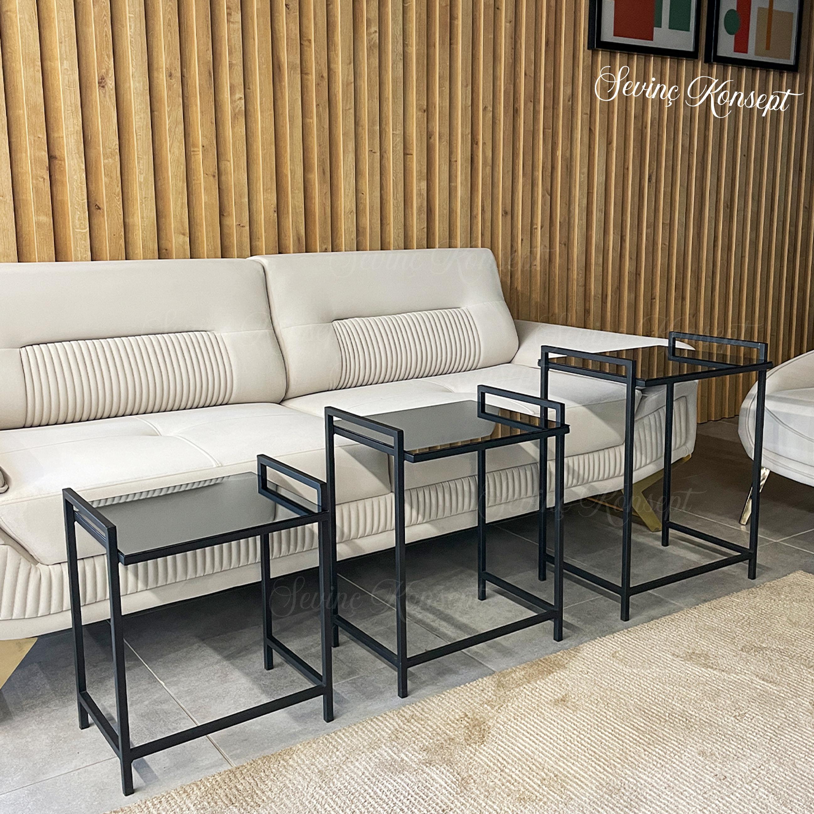 - 3'lü SİYAH Rana Sehpa, FÜME Camlı, Çok Amaçlı Zigon Sehpa, Yan Sehpa, Metal Sehpa ;