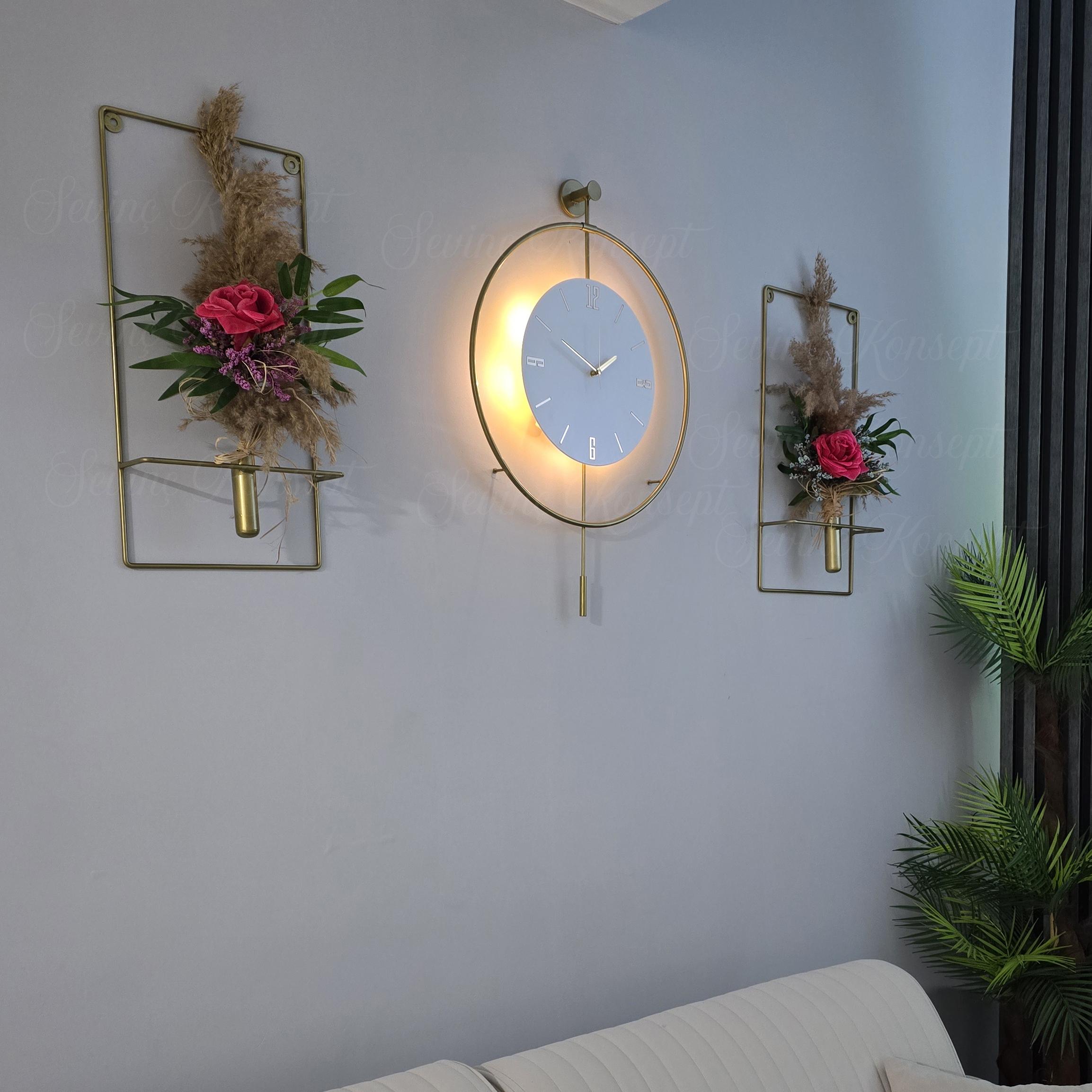 VİP SET 3'LÜ GOLD Tiktok Kristal, Çiçeklikli Modern Dekoratif Sarkaçlı Duvar Saati
